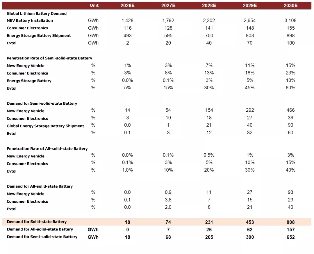 Driven by policy support, market demand, and technological breakthroughs, the industrialization of solid-state batteries is on a clear trajectory, with a broad market potential. We estimate that global solid-state battery shipments will reach 808GWh in 2030, of which semi-solid-state battery demand is expected to exceed 650GWh in 2030. Power, energy storage, EVTOL, and consumer electronics will account for 466GWh, 90GWh, 60GWh, and 36GWh of semi-solid-state battery installations, respectively, with penetration rates of 15%, 10%, 60%, and 23%, respectively. We estimate that all-solid-state batteries will achieve technical finalization and small-scale mass production in 2027, and commercial mass production in 2030. Demand for all-solid-state batteries is expected to exceed 150GWh in 2030, of which power, EVTOL, and consumer electronics will account for 93GWh, 40GWh, and 23GWh of all-solid-state battery installations, respectively, with penetration rates of 3%, 40%, and 15%, respectively.