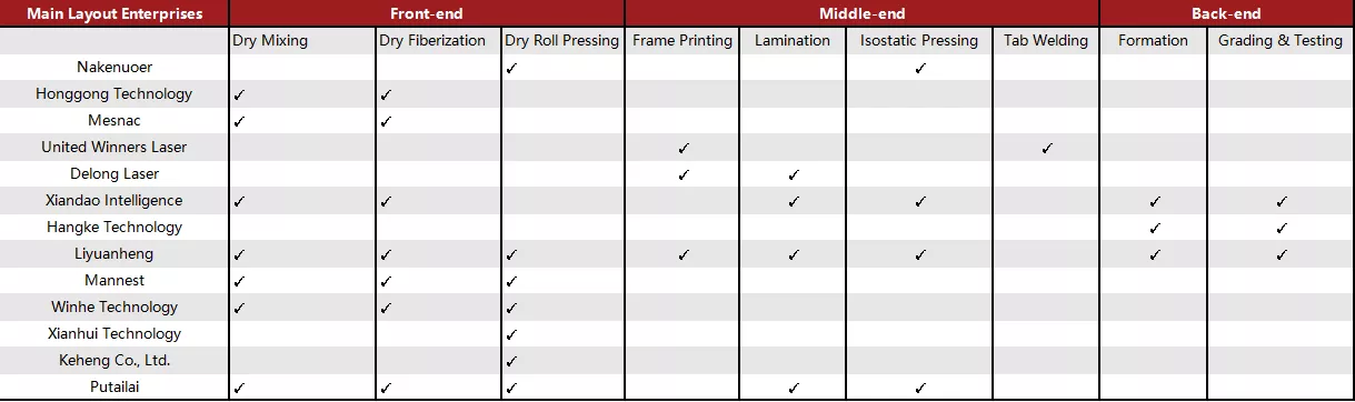| Nakenuoer | The multi-roll continuous rolling equipment of Qingyan Nake (a company in which Nakenuoer holds shares) has undergone multiple upgrades and iterations. It has launched series of dry electrode equipment such as eight-roll and ten-roll, supporting the production of pole pieces with various materials (e.g., ternary, lithium iron phosphate, silicon carbon). |