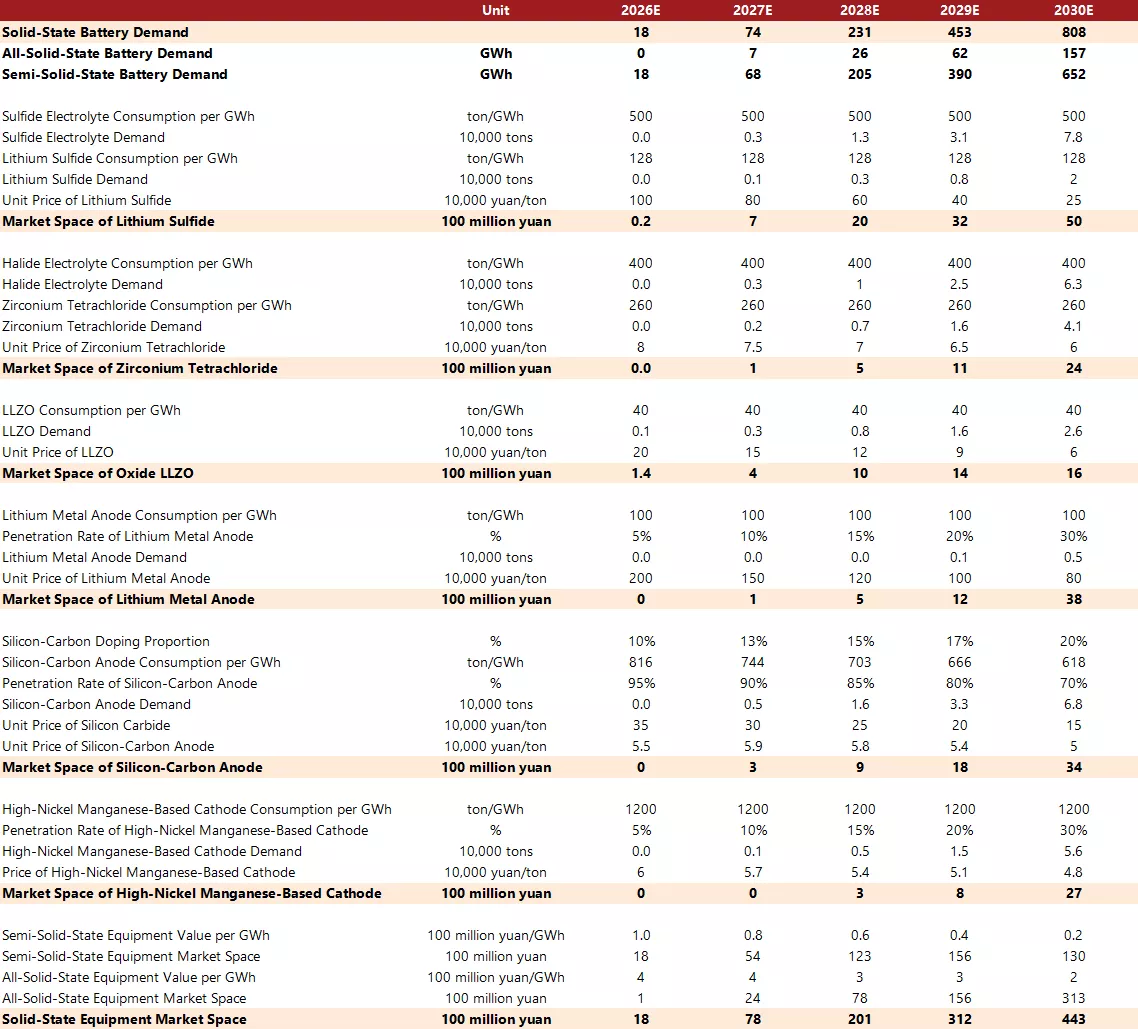 On the equipment side, we estimate the solid-state battery equipment market to be worth 44.3 billion yuan in 2030, including 31.3 billion yuan for all-solid-state battery equipment and 13 billion yuan for semi-solid-state incremental equipment. On the materials side, we estimate the market potential for lithium sulfide, zirconium tetrachloride, LLZO, lithium metal anodes, silicon-carbon anodes, and lithium-rich manganese-based cathodes to be 5 billion yuan, 2.4 billion yuan, 1.6 billion yuan, 3.8 billion yuan, 3.4 billion yuan, and 2.7 billion yuan, respectively.